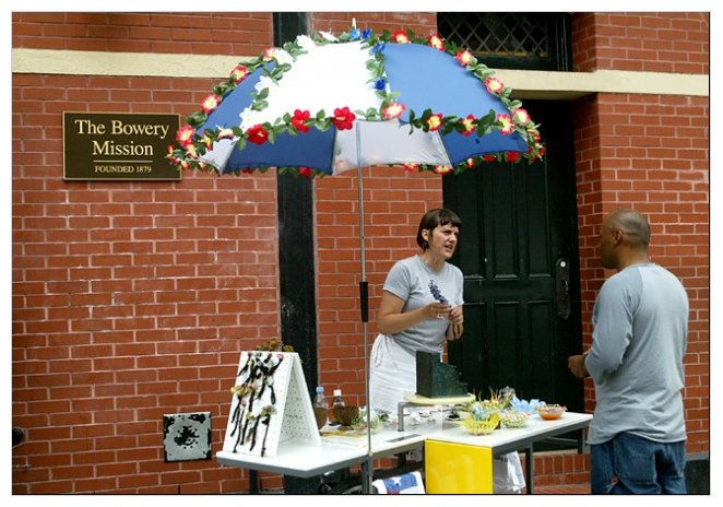 When the New Museum of Contemporary Art purchased property to move in to the Lower Eastside of New York City in 2003, Marion Wilson was invited to be part of “Counter Culture” curated by Melanie Cohn; a public art exhibition meant to introduce the Museum to the neighborhood before it broke ground. Six artists in the exhibition were invited to select a neighboring institution or business to partner with in the creation of a new work. Marion chose to partner with the Bowery Mission – both a public soup kitchen and a shelter for men in rehabilitation. The men who lived in the Bowery building ran the public soup kitchen and cleaned and sustained the facilities. Referencing the Lower Eastside’s turn of the century immigrant and pushcart tradition and Claes Oldenburg’s 1960s project on the LES called The Store, Marion named the project This Store Too.